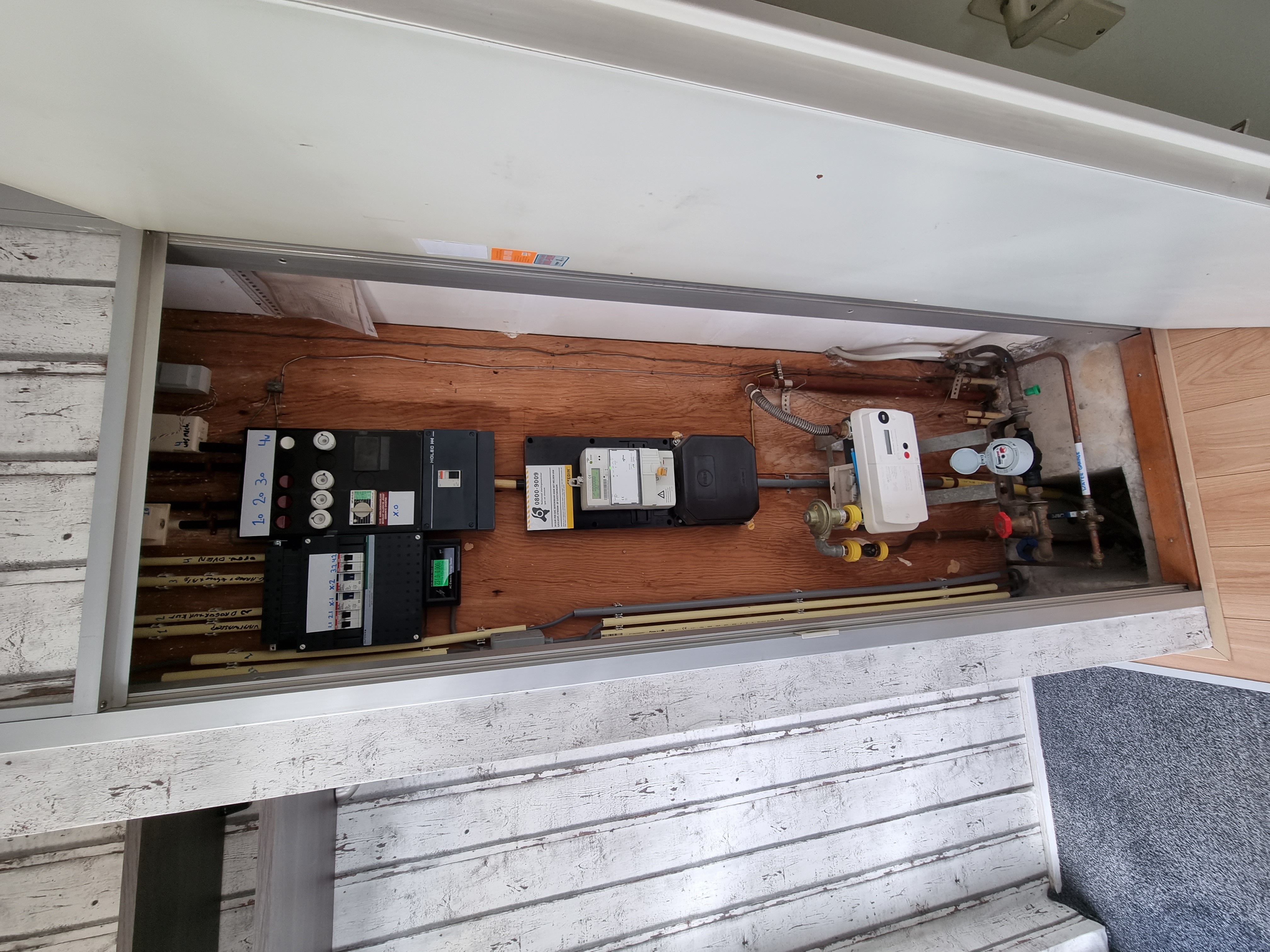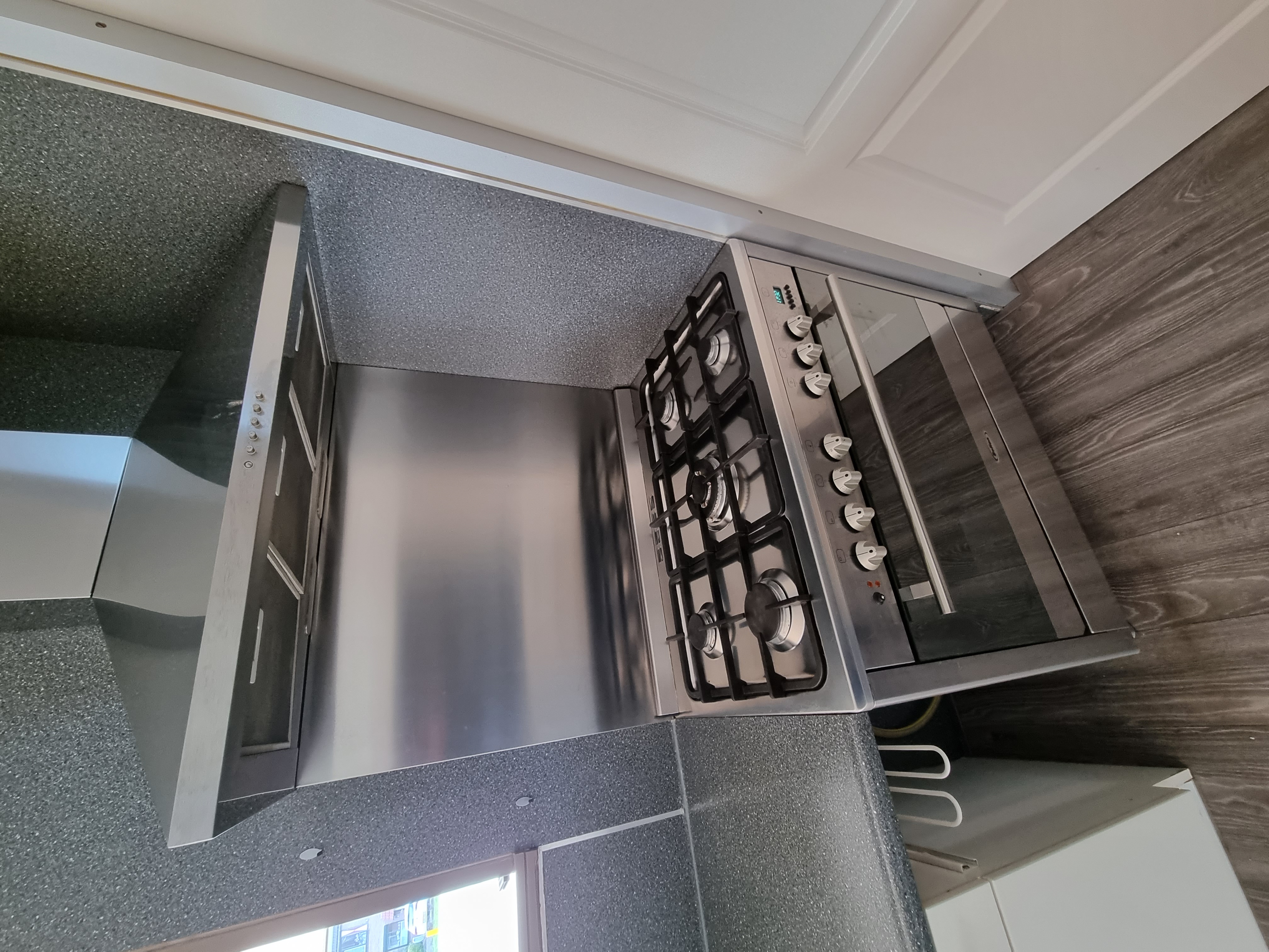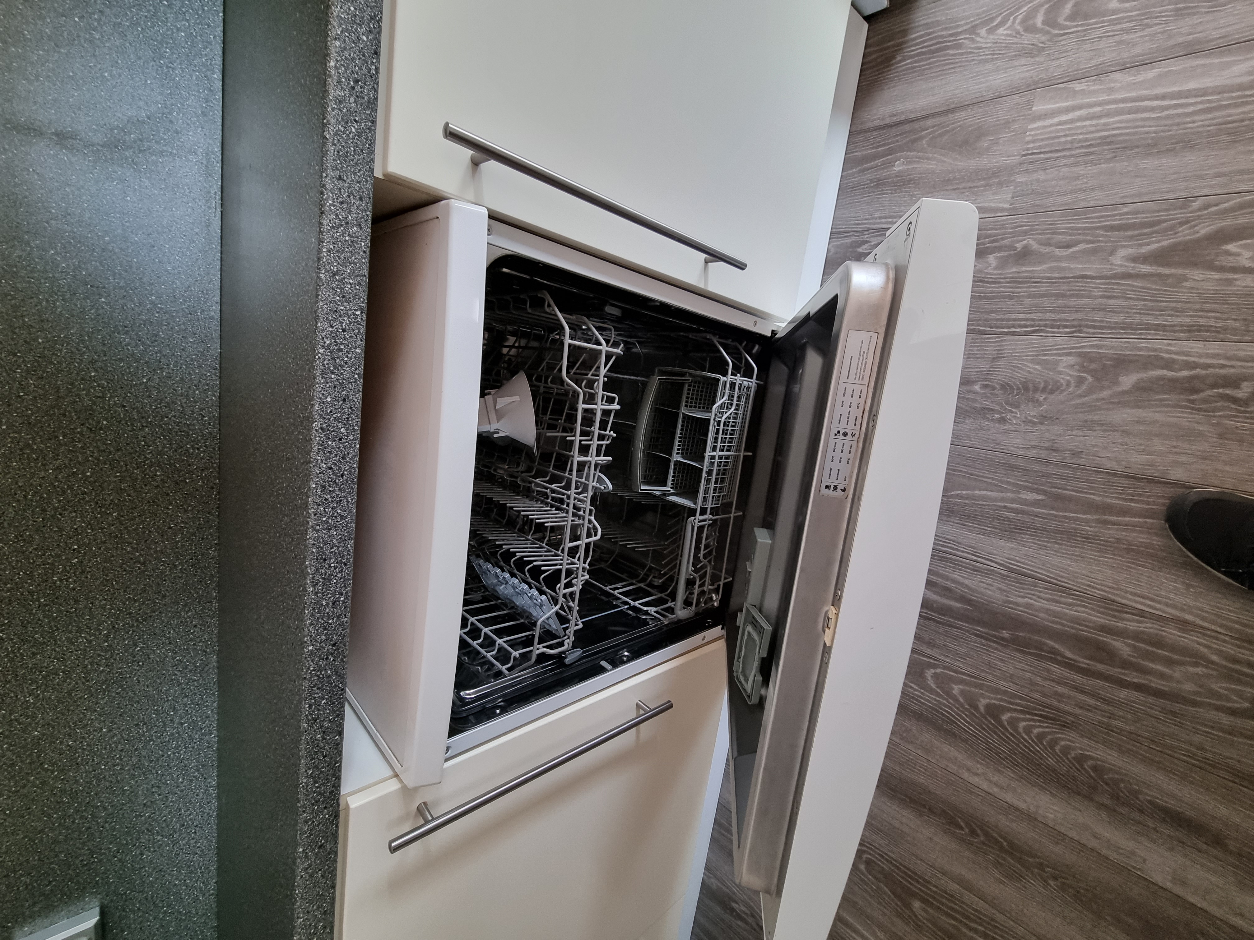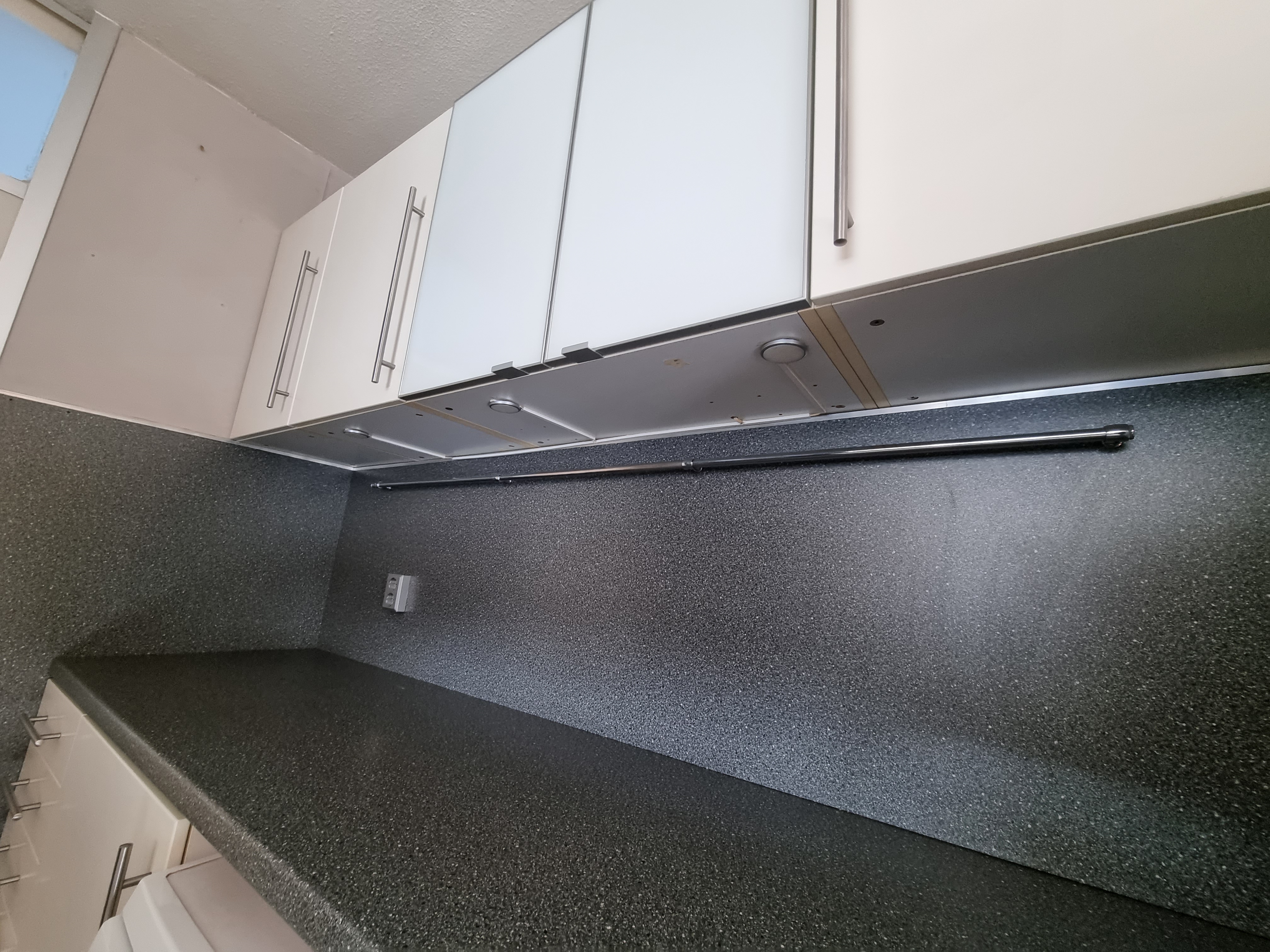 De keukeninrichting bestaat uit een keukenblok aan 2 zijden met veel opbergruimte. Wij stellen ons voor dat als je de keuken wilt upgraden hier een prachtig kookeiland kan verschijnen.