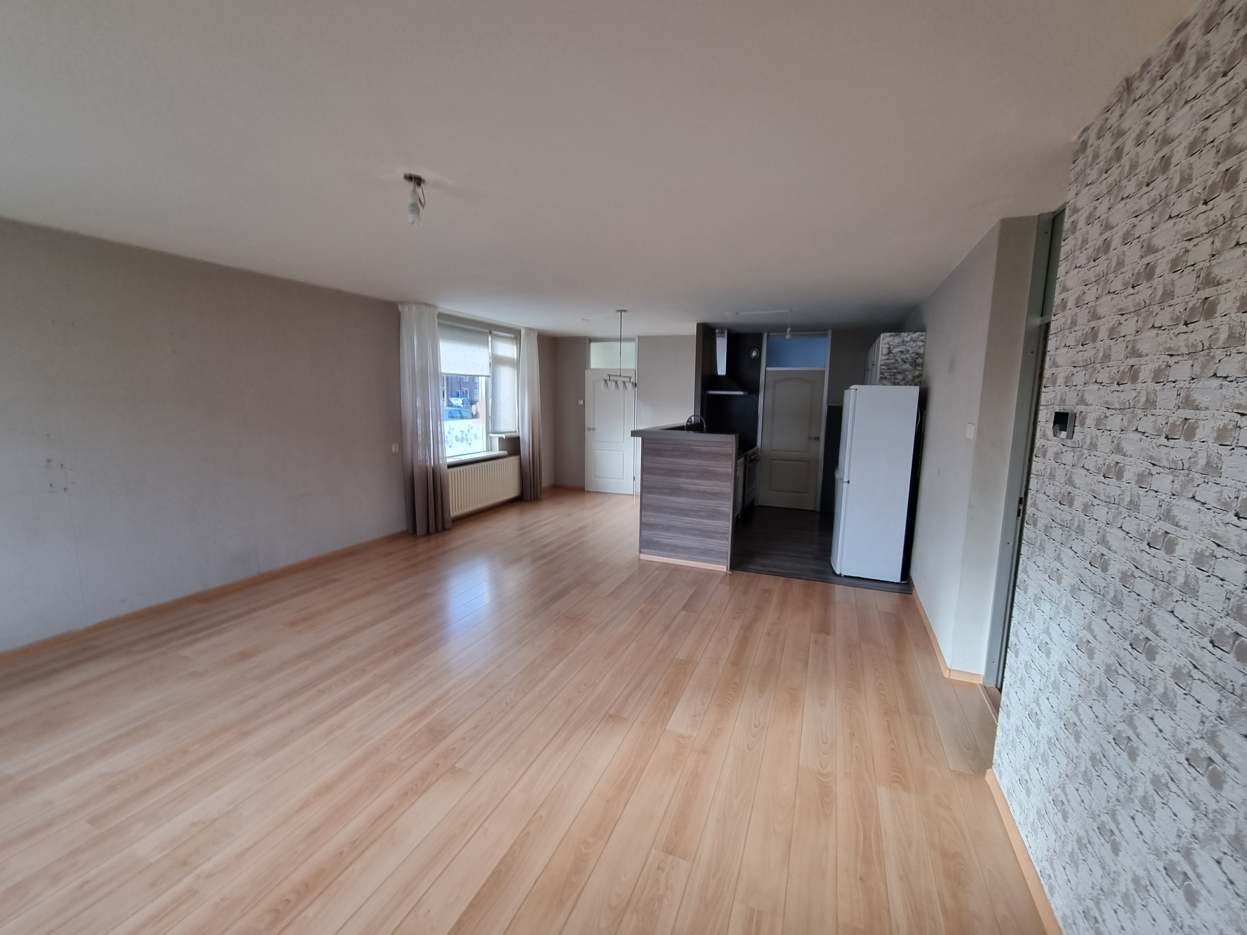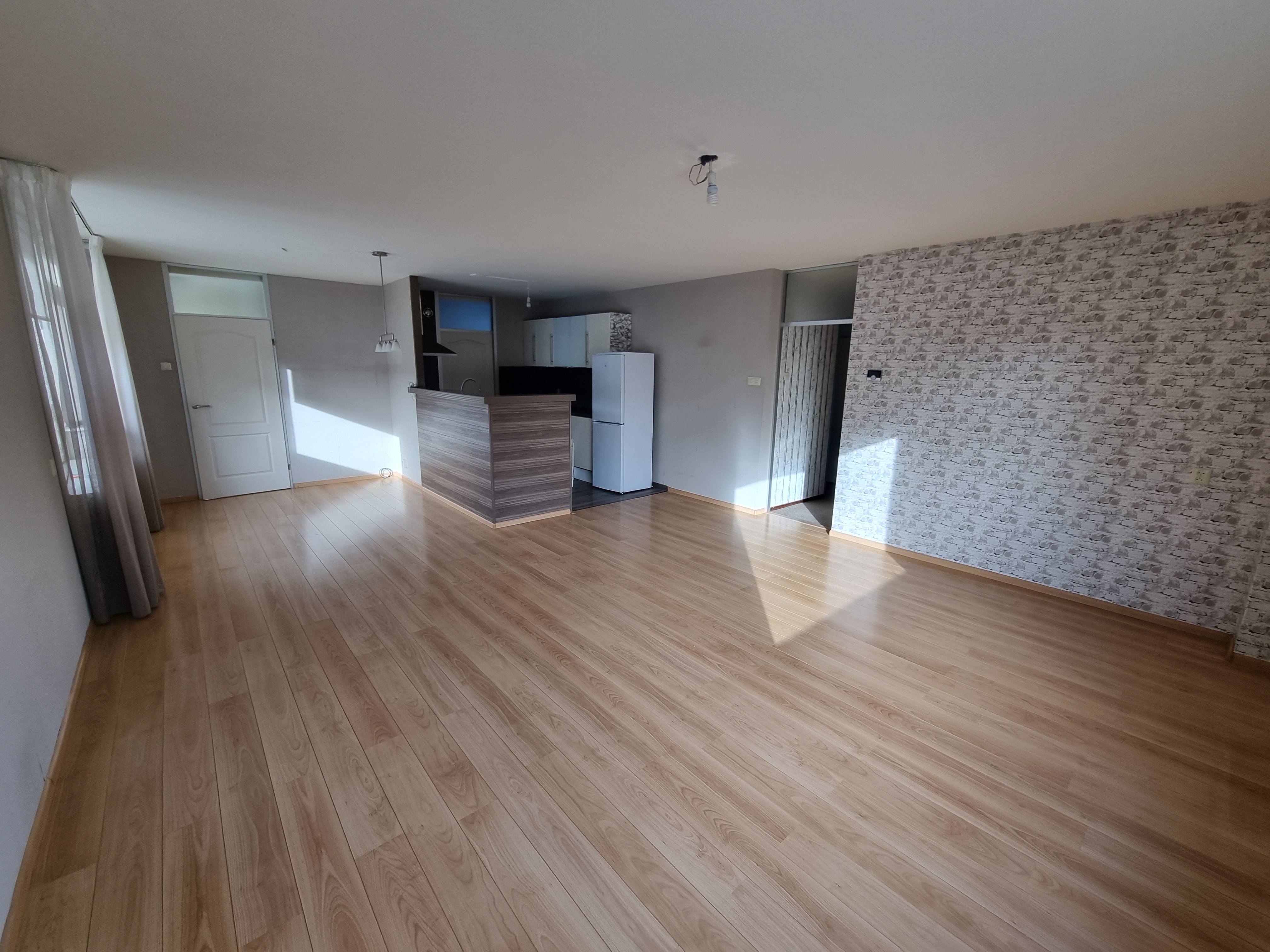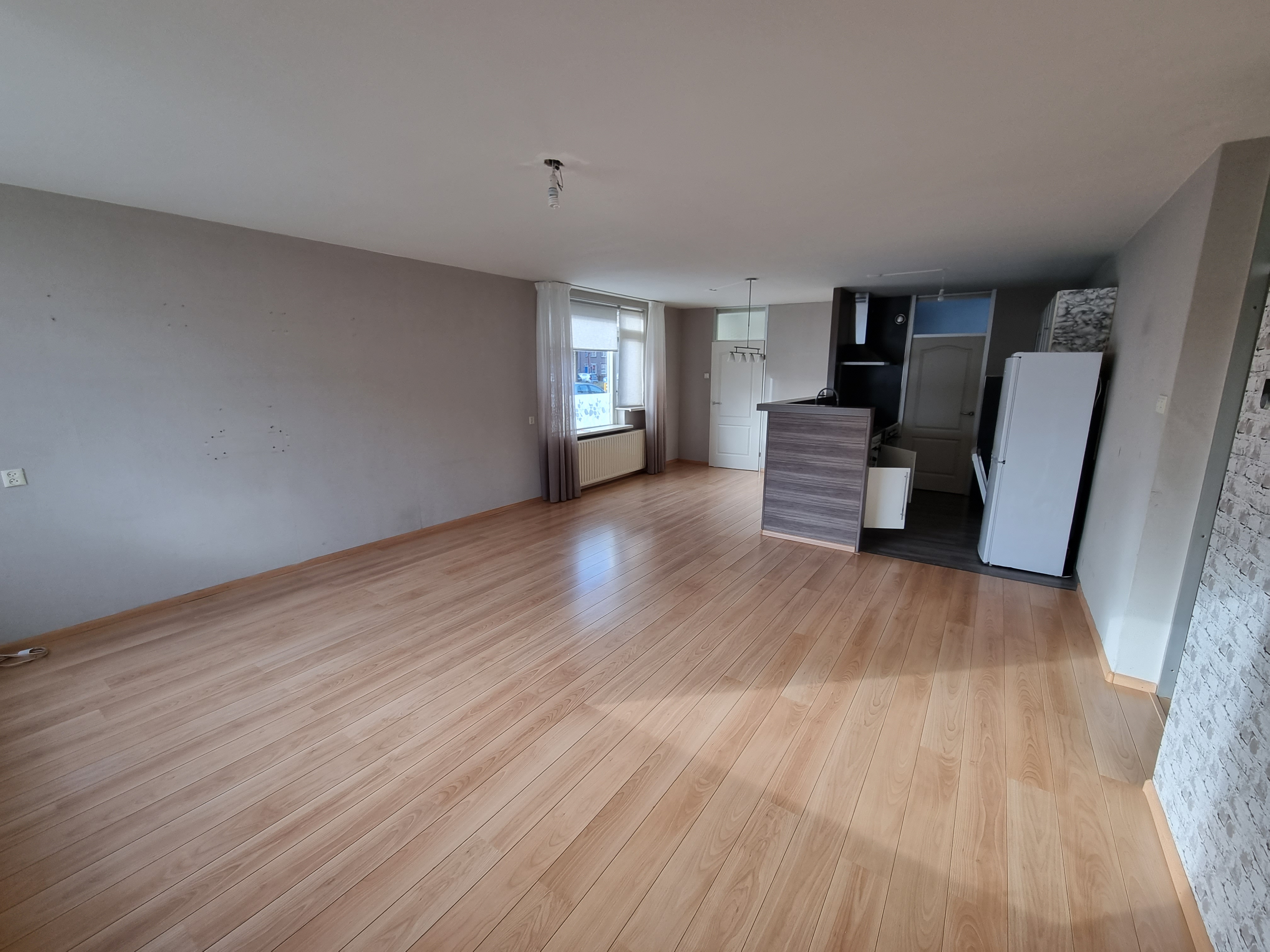 Begane grond: Entree met meterkast en vernieuwde luxe toiletruimte voorzien van fonteintje. De ruime woonkamer met open keuken is groot ca.42,5m2 en voorzien van een lichte laminaatvloer.