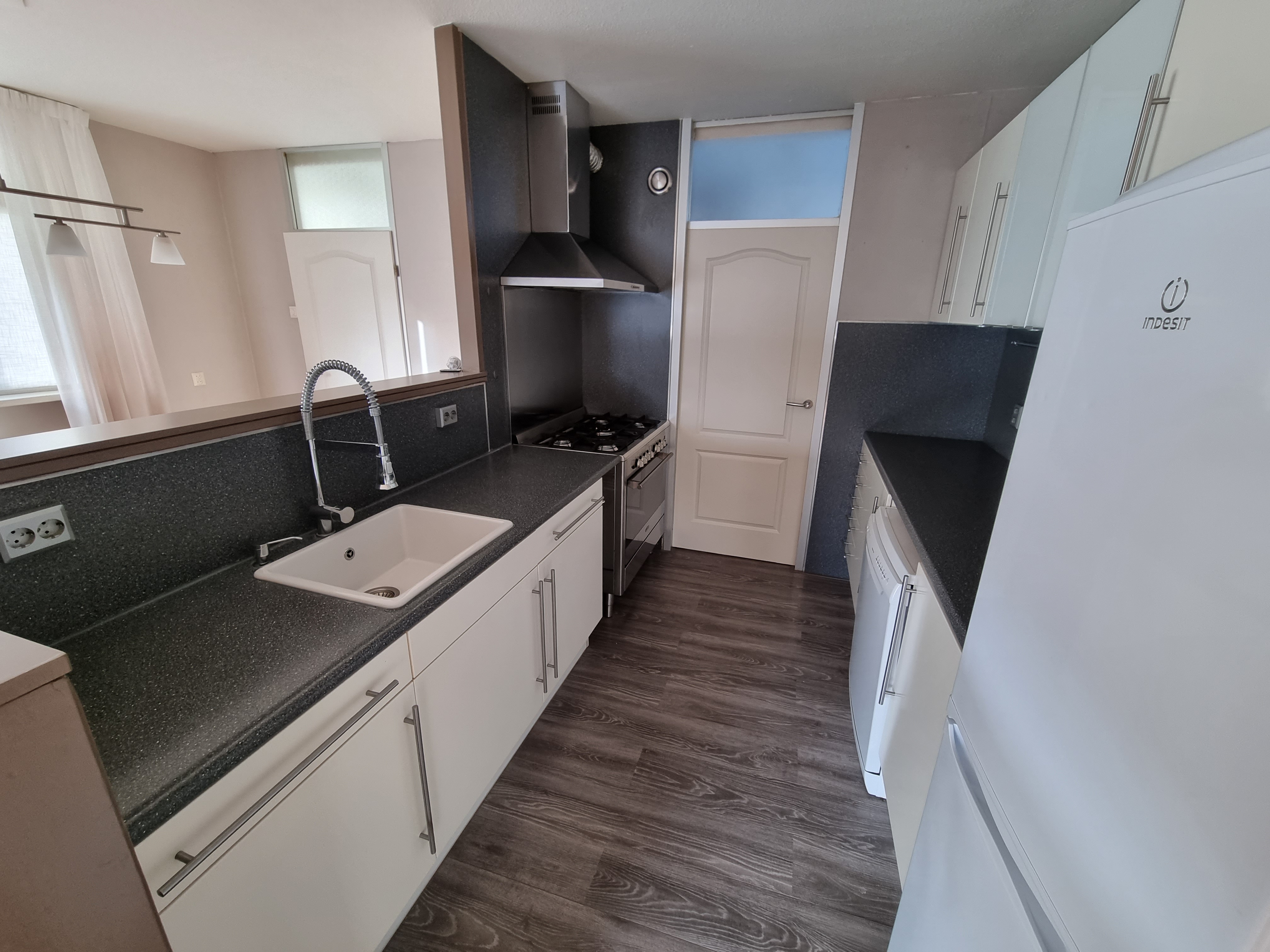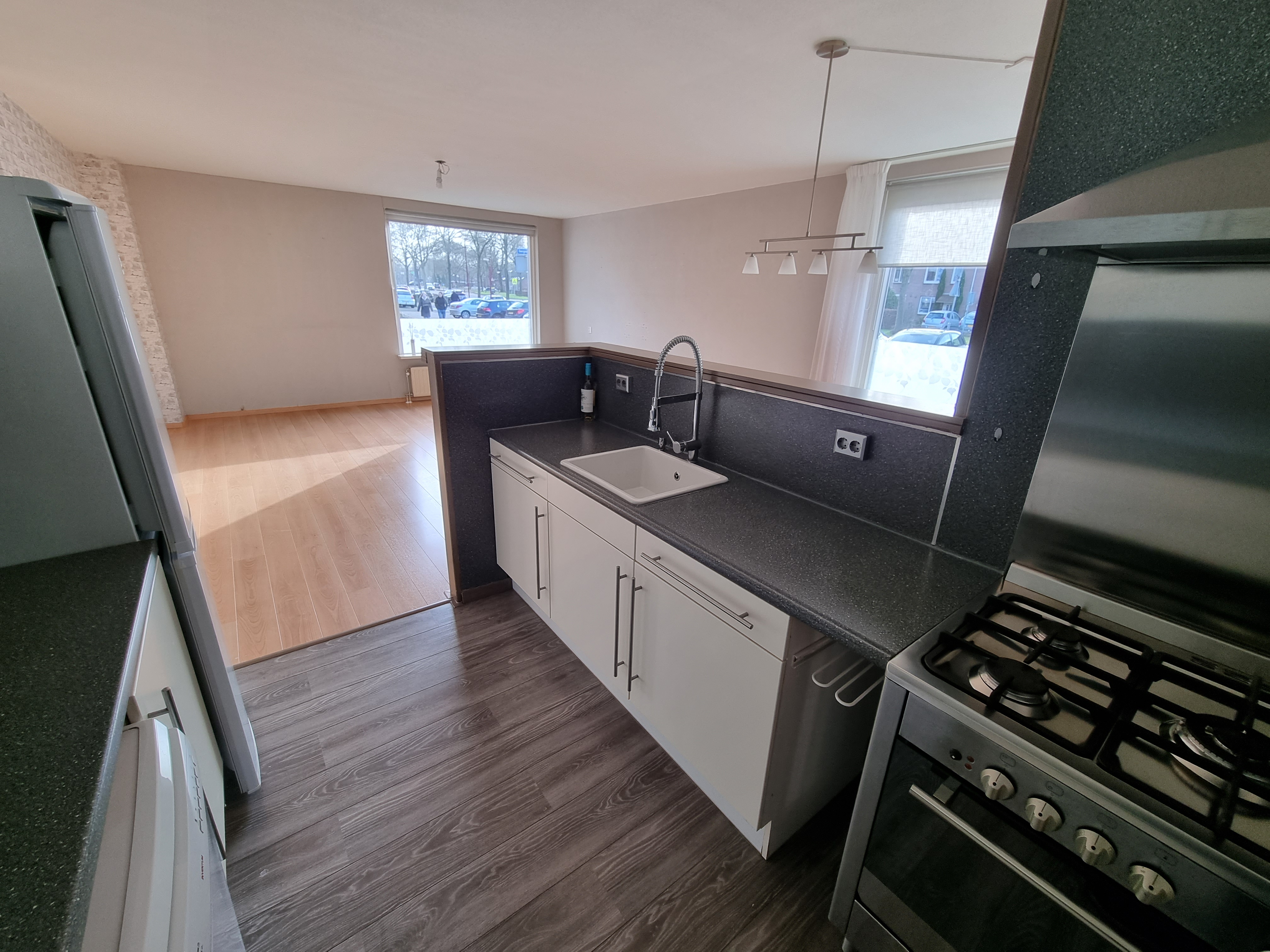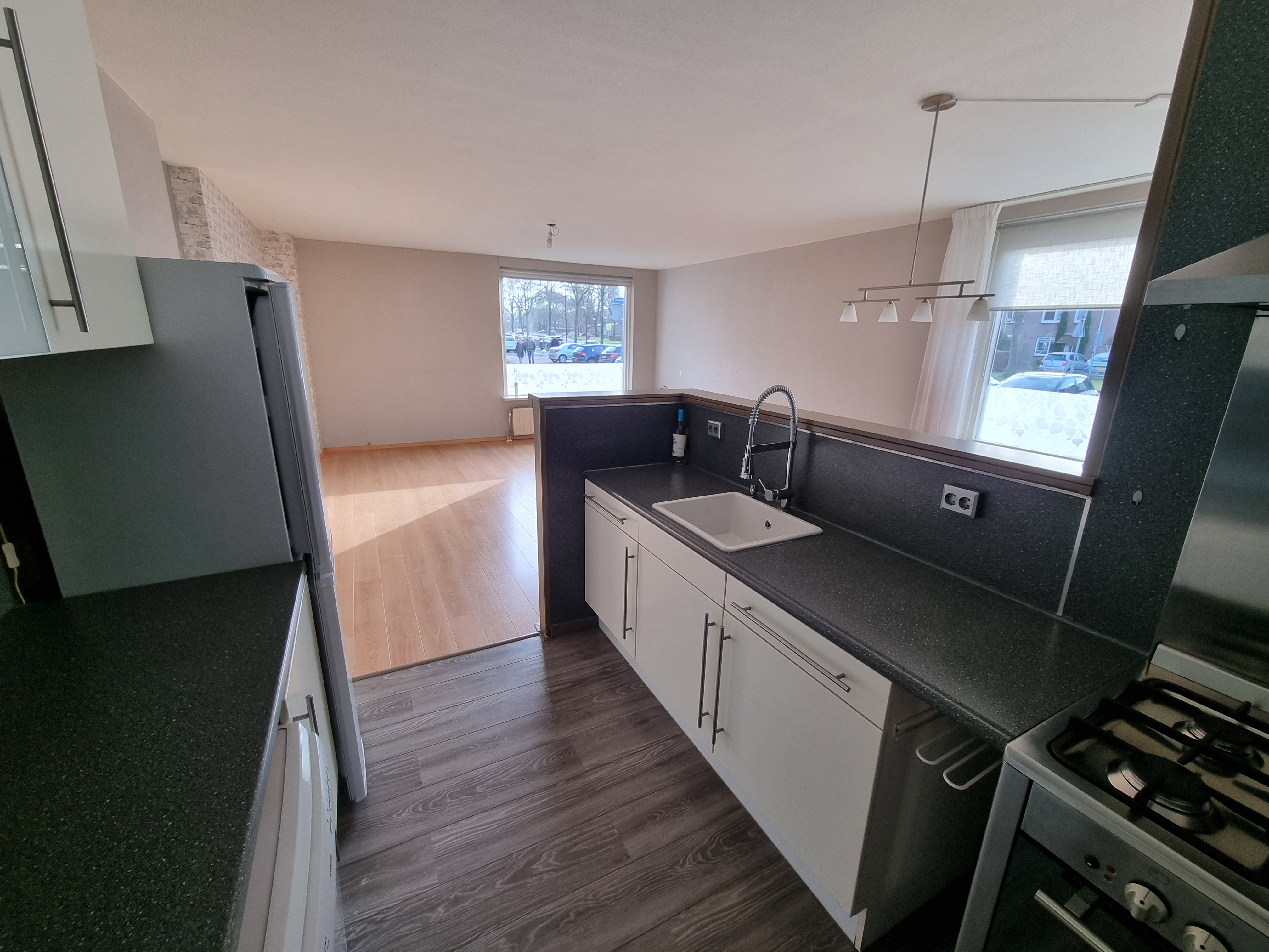 Begane grond: Entree met meterkast en vernieuwde luxe toiletruimte voorzien van fonteintje. De ruime woonkamer met open keuken is groot ca.42,5m2 en voorzien van een lichte laminaatvloer.