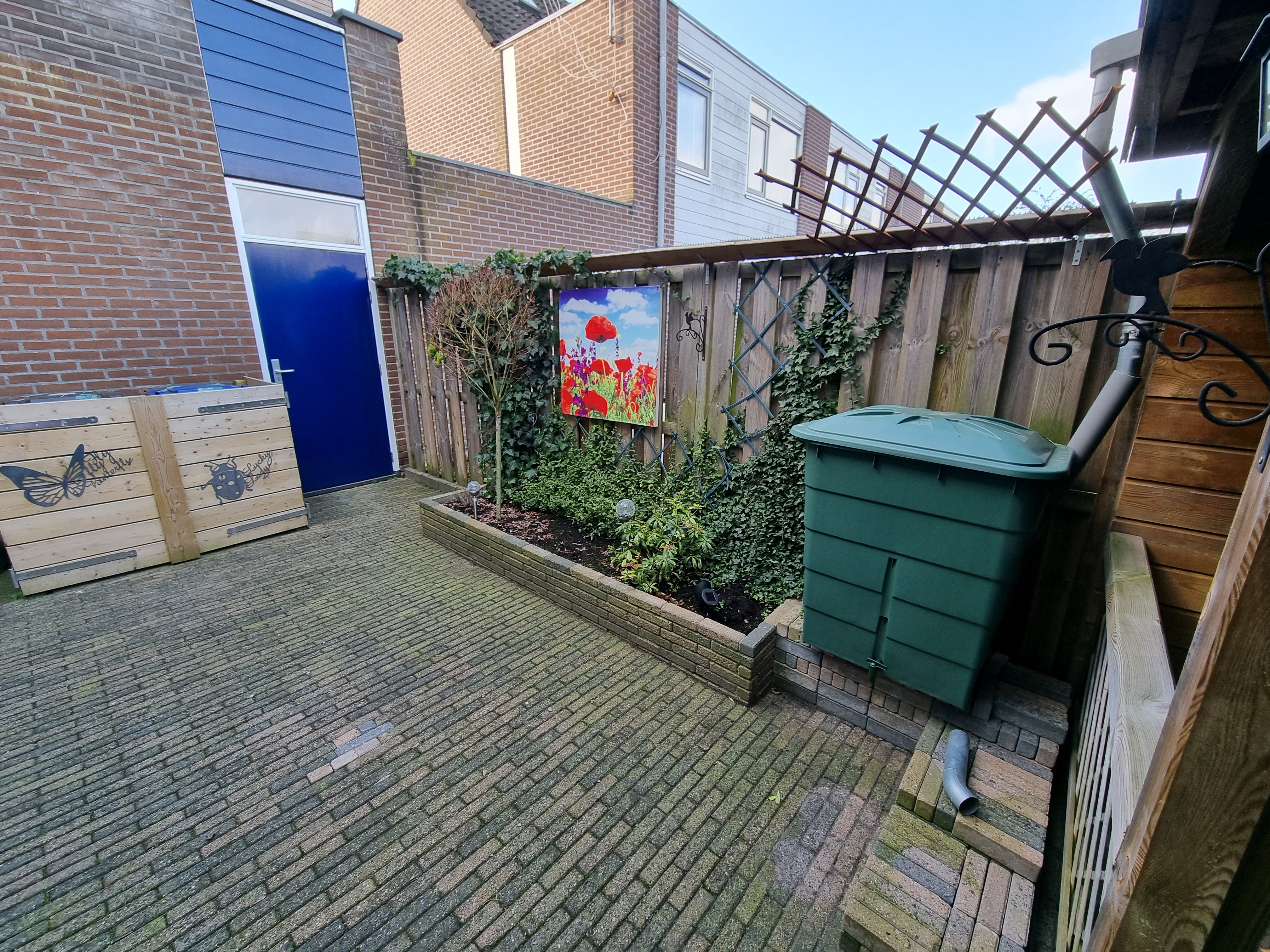 Vanuit de bijkeuken is er toegang tot de goed aangelegde achtertuin op het westen. Deze tuin is voorzien van mooie veranda waar het heerlijk genieten is tot in de late avonduren.